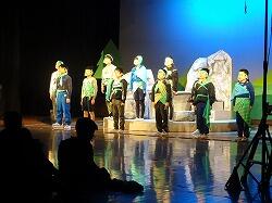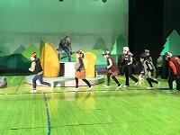 物語は進んで、1幕後半、主人公のガブがオオカミの仲間に取り囲まれ、無理矢理、決闘をさせられる場面。6年生全員がオオカミの衣装で登場し、群れの仲間の役を熱演しました。