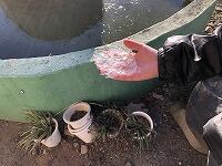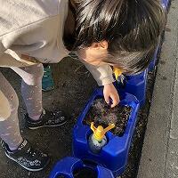 「まだ、こんなに大きな氷があるよ」と、池の中をのぞいてから…植木鉢の周りに場所を移して話が盛り上がっています。