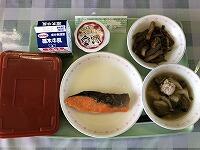 ごはん・県産ヤシオマスの塩焼き・五目きんぴら・みぞれ汁・シモンちゃんゼリー・牛乳