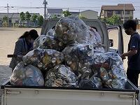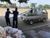▲職員も朝早くから集まって、学校に保管しておいた資源物をトラックに積み込みました。本部役員さんも、軽トラックでかけつけてくださり、往復していただき、大変助かりました。学校の近くにお住まいの農家の方が、トレーラーを使って、学校の物置に保管していた資源物を、藤田倉庫まで、運んでくださいました。本当にありがとうございました。