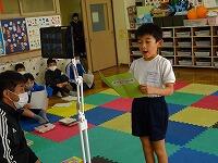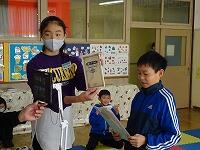 図書集会で行われた「読書名人へインタビュー」のコーナーでは、計画・図書委員が代表児童に「家読(うちどく)の記録を続けるコツ」などについて聞きました。