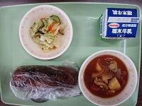 ココア揚げパン トマトシチュー かんぴょう入り野菜サラダ 牛乳