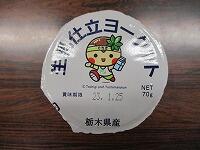 現在の給食です。地産地消ということで、かんぴょうの入った汁やいちごデザートがでました。(シモンちゃんは、JAしもつけのマスコットキャラクターです。)