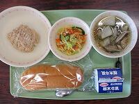星現在の給食です。地産地消ということで、かんぴょうの入った汁やいちごデザートがでました。(シモンちゃんは、JAしもつけのマスコットキャラクターです。)