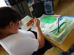 4年生の図工の時間。それぞれが自分のタブレットで撮った校庭の木の写真をもとに、絵を描いていますキラキラ構図はもちろん、葉や幹の色も工夫しています花丸