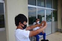 体育のときは、「マスクを外して、だまって活動」を約束にしています。全体に呼び掛けるだけでなく、個別に声掛けもしていますが、子どもの中にはマスクを付けたまま活動している子もいました。朝のうち肌寒いぐらいだったので、その時の気温に合わせて自分で判断しているようです。この後、気温が上がり暑くなってきたら、熱中症予防のためにマスクを外したり、涼しい部屋や話をするときはマスクを付けたりして調節しましょうね。