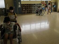 西昇降口から保健室前、職員室前を通り、東昇降口を折り返して、西昇降口に戻ります。2人ペアで車いすに乗る人と介助する人を交代しながら実施しました。