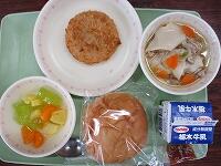 バーガーパン ハムカツ 小袋ソース ワンタンスープ フルーツのぶどうゼリー和え 牛乳
