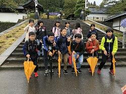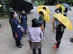 飯盛山にて、見学中です。ほとんど傘をささずに見学できるぐらいの天気です。