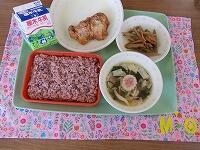 【赤飯・鶏の唐揚げ・五目きんぴら・すまし汁】でした♪