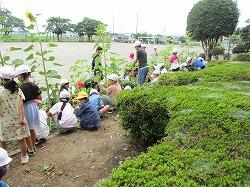 今日の昼休み、わくわくタイムの時間を使って、職員室前花壇にあるひまわり畑の除草作業等を行いました。