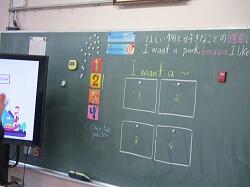6年生の外国語科の授業です。『 I want a~because I like~.』『私は、~がほしいです。なぜなら、理由は~。』