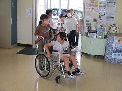 福祉についてのお話を伺ったり、実際に車いすに乗ったり、介助したりする体験をしました。