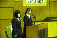 この日、新たに着任した5名の職員を生徒に紹介した後、生徒代表がお迎えの言葉を転入職員に伝えました。