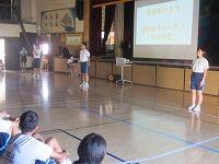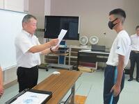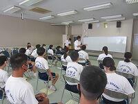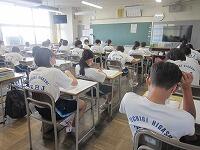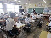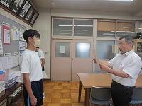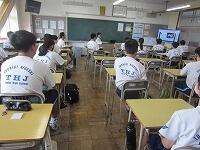 始業式に続いて、生徒指導主事から2学期の生活面での努力点について呼びかけました。暑さ対策のため会議室と教室をオンラインでつないで、生徒は教室から視聴しました。