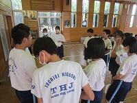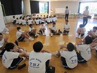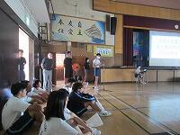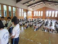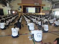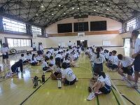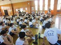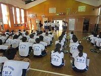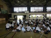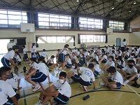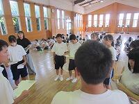 10日後に運動会を控えたこの日、まず体育館で全生徒が昨年度の運動会の様子を見て、イメージを共有しました。その後、1組(黄)は体育館で、2組(赤)は武道場で、3組(青)は多目的ホールで、それぞれのチームごとに3年生を中心に士気を高めるとともに、作戦を練りました。