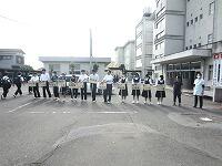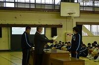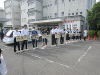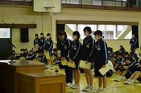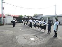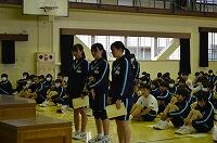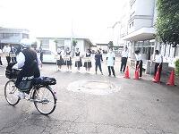 本校では、進んであいさつをする態度を育て、望ましい人間関係づくりや社会で必要な資質を育てることをねらいに、毎朝登校時に、担当生徒が交替であいさつ運動を行っています。この日は各部の部長さんが校門付近で、登校する生徒にあいさつを呼びかけました。