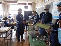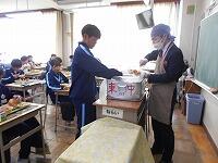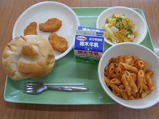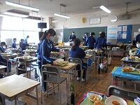 この日、1・2年生の今年度の給食が最後となりました。写真は、担任と給食当番さんによる給食配膳の様子です。なお、本日の給食のメニューは、ミニ米粉パン、牛乳、ペンネボロネーゼ、チキンナゲット、コーンフレークサラダでした。今年度もごちそうさまでした!