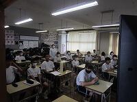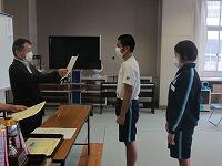 この日の午後、6月から7月にかけて受賞した生徒の表彰式を、感染予防の観点からリモート方式で実施しました。受賞者代表生徒が会議室で賞状を受け取る様子を、生徒は教室で参観しました。