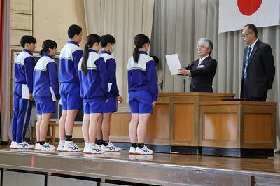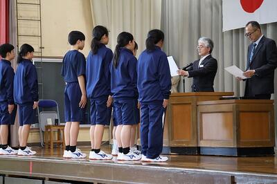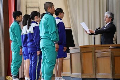 続いては、学級委員の任命です。入学して間もない1年生から壇上に上がり、任命書を手渡されました。大きな返事と堂々とした振る舞いで、こちらも新しいクラスをリードしていこうという意欲にあふれていました。