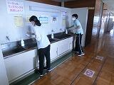 学校再開に伴い、放課後の消毒も始まりました。水道やトイレ、電気のスイッチやドアノブなど、多数の人が触れるような場所は、手分けして次亜塩素酸水で消毒をしています。さび防止で消毒した後は水で拭き取るなど大変な作業になりますが、生徒の安心・安全のため毎日頑張ります。