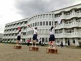 お知らせ大変遅くなりました。延期となっておりました体育祭が2日間に分かれて分散体育祭として今週11月15日(月)にスタートしました。本年度から全学年を縦割りで赤組・青組・黄色組の3色に分けて行う色別対抗種目が中心となっています。現時点で各学年個人走、男子団体の「竹ボール運び」、女子団体の「玉入れ」が終了し、赤組420点、青組407点、黄色組401点と赤組が一歩リードしていますが、僅差での争いとなっています。