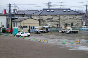 校舎北側の駐車場には電源のキュービクルがあります。 ここから武道場までの電線の埋設工事が始まりました。 11月いっぱいは、駐車場所が制限されます。 建設工事は順調に進んでいるようです。