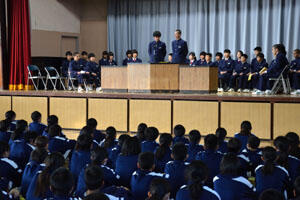 任命式の後、学習訓練強調週間のための学習指導の話しがありました。 各クラスの学習委員さんから、クラスの学習の目標が述べられました。 「チャイムで授業が始められるようにする」「集中して授業に臨む」「忘れ物をしない」など、具体的な課題が出されたので、みんなで協力して達成してほしいです。