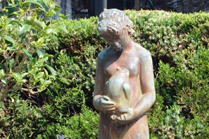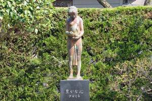 昭和62年に立てられた「少女と梟(フクロウ)」の像です。 どこにあるかわかりますか? 台座に「豊かな心」と刻まれています。 学校教育目標の二番目ですね。 この像は本校第3回卒業の彫刻家である鈴木徹(すずき てつ)さんの制作によるものです。 この作品に添えられた次の文に、鈴木さんの思いが綴られています。