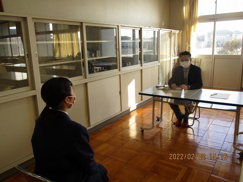 1/31~2/3、学校運営協議会委員の皆様にご協力いただき、県立高校特色選抜入試の面接練習に協力していただきました。教員が何度か受験生に面接の指導は行いましたが、2/7の入試に向けての総仕上げとして、学校運営協議会の方に面接官になっていただき、指導・助言をしていただきました。教員以外の方が面接官になることで、本番の雰囲気に慣れさせることがねらいの一つです。これまでの練習にはなかった緊張感をもって、どの生徒も面接に臨んでいました。