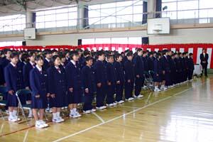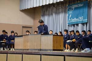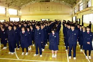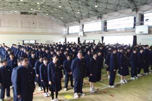 新年を迎え、皆清々しい表情で始業式に臨みました。いよいよ3学期が始まります。3年生はすでに私立高校の試験が始まっています。総仕上げの学期、それぞれの目標に向かってがんばってください。「人の役に立つことの喜びを感じて欲しい、"与えられる喜び"より"与える喜び"を知って欲しい。そのためのアクションを起こす年になるように」という校長式辞の後、3学期の抱負を各学年の代表が発表して始業式を終えました。