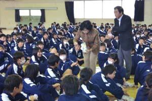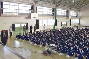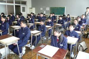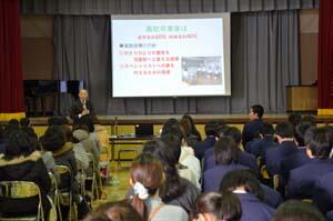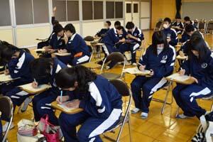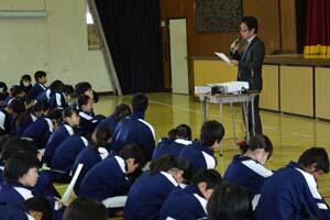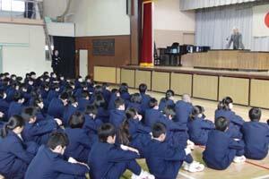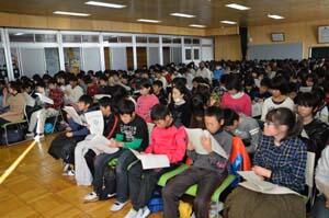 水曜日は集会があります。 今日は新しい生徒会役員と3学期学級委員長の任命式の後、学習集会がありました。 学習指導主任のID先生による"学習訓練強調週間"にちなんだお話です。 学習のアンケート結果をもとに、授業の受け方、話の聞き方、予習や復習についてなど細かな指導をいただきました。 生徒の皆さんは、やはり勉強に対する関心が高いようです。 寒い体育館で長時間のお話でしたが、最後まで真剣に聞いていました。 がんばろうね、勉強!