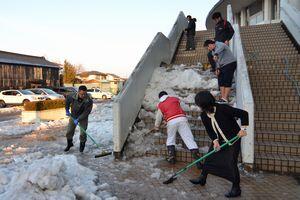 大雪でした。 南中の昇降口は校舎北側の2階,雪が積もるとしばらくは融けません。 今日はテスト前で部活中止なので,先生方が放課後に雪かきをしました。 その前の週に降った大雪の時は,部活動の生徒達がきれいにしてくれました。とても助かりました。