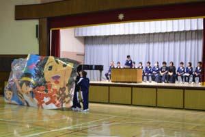 3年生を送る会でした。 第一部はセレモニーです。1・2年生が心を込めて作った絵馬と千羽鶴の贈呈、合格祈願ダルマの目入れ、学年合唱を行いました。 3年生への感謝の気持ちが込められた暖かな雰囲気で、なごやかな時間が過ぎていきました。 前学年主任の堀江先生、江田訓子先生はじめ、お世話になって異動された先生方のビデオレターには大感激、そして大笑い。