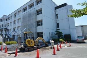教室へのエアコン設置工事,屋上への太陽光パネル設置工事,体育館のWi-Fi設置,体育館の照明補強そしてボーリングによる地質調査と測量,これらの工事が夏休み中に行われているのです。酷暑の中で,ほんとうにご苦労様です。