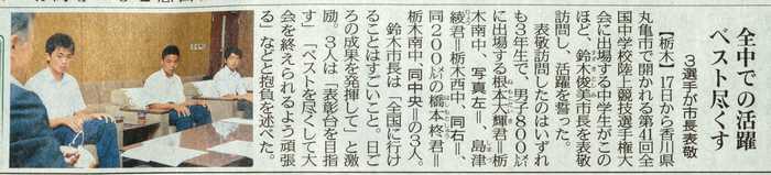 本校の2名と栃木西中の1名の陸上部員で、8月4日に栃木市鈴木市長さんに報告に行きました。すでにケーブルテレビCC9で放映されていますが、下野新聞にも掲載されました。