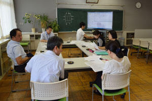 夏休みには、たくさんの研修が先生方を待っています。 今日はまず最初に県の学力向上アドバイザーによる研修が午前中に(写真右)あり、2番目の研修は、午後すぐに四小、南小、南中の合同で体罰防止の研修会、3番目の研修はそのまま3校合同で、小中連携のための道徳を中心にした研修でした。1日中ず~っと研修をしていて、この後6時から4番目の合同研修(^^)です。