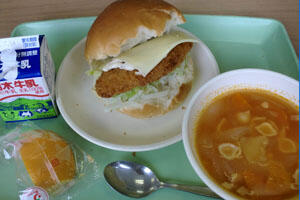 フィッシュバーガー、ミネストローネスープ、オレンジとすべてカタカナなのが今風の今日のメニュー。 魚は「ホキ」で、オーストラリア~ニュージーランド近海で捕れ、世界に流通しているそうだ。マックのフィレオフィッシュの材料のひとつでもある。(by wikipedia) けっこう恐い顔をしている。 茹でキャベツ、チーズとともにパンにはさんでタルタルソースで食べます。 パンはカット代の節約のため手で2つに割ります。 給食費の値上げがしばらくないのも、こうした小さな節減を積み重ねているからなんですね。