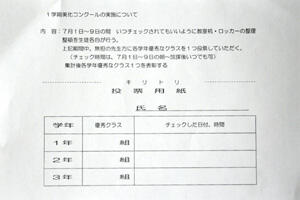 1学期の美化コンクールがあります。 審査は教室の机、ロッカーの整理整頓、ゴミの状況、床、黒板、掲示物などなど、今日が審査の最終日です。 15日の表彰式で優秀クラスを表彰します。 楽しみに!