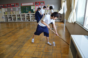 清掃の後、それぞれのクラスの環境美化委員さんが、教室のワックスがけをしました。 こうしてメンテナンスをしながら25年間も使っています。 美化委員さん、ごくろうさまでした。