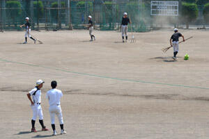 毎日暑いですね。 今日も炎天下、新人のチームになったそれぞれの部では、新人戦に向けて練習に励んでいます。 野球部も12:30に練習を終え、グランド整備をしています。 高校生の先輩でしょうか?ユニフォーム姿で下級生を励ましに来てくれているようです。 学校でいちばん涼しい北の日陰の温度計は・・・・・ 暑さに負けずにがんばれ、南中生!