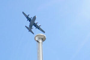 大きな音を立てて学校の真上を旋回するC-130輸送機。 翼にはUSAFの文字が見えることから、おそらく横田基地を飛び立ち、有視界飛行訓練をしているものと思えます。 まるで南中を目印に旋回しているかのようです。 中央の銀色のポールは、国旗掲揚のポールの上部です。 このところしばらく静かだったのですが、また飛び始めたようです。 数機の編隊で来ることもあります。 本日11:13撮影。