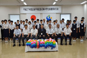 毎年8月6日(原爆が広島に投下された日)に、広島市で平和記念式典が開かれます。 今年も栃木市のすべての中学校から男女それぞれ2名の代表が、記念式典に参加します。 それぞれの学校で折った千羽鶴を持って行きます。 今日は、栃木市の庁舎で派遣団の壮行会がありました。 被爆者の体験話や原爆資料館で自分が感じたことを、みんなに伝えてくださいね。 南中の代表はどこにいるか、わかるかな?