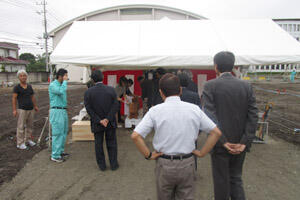 小雨交じりの中、武道場の建築工事が始まるのに先立って、市長さん、教育委員長さん、教育長さん、市議会議長さん及び議員さん、建築業者さんなど建築に関わる皆さんのご臨席の下、安全祈願祭が行われました。 いわゆる地鎮祭です。 工事の安全はもとより、生徒が末永く安全にここで活動できるようお祈りしました。