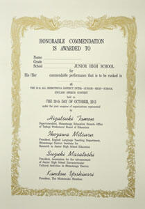 学校祭(南斗祭)の準備で大忙しの毎日です。 そんななか、下都賀地区英語スピーチコンテストが文化会館で開かれました。 本校からも各学年代表が参加しました。 題名は1年生から順に My Brother 'Hakuto' , The Eledtronic Organ and Me , My Sky High Dream です。堂々と発表できました。 写真のような英語の賞状をいただきました。