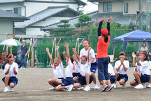 豪雨で被災し、学校に来られなかった I 先生が体育祭に駆けつけてくれました。 クラスの生徒達も大喜び、そして長縄跳びでは、なんと1位。 悲喜こもごもの体育祭。
