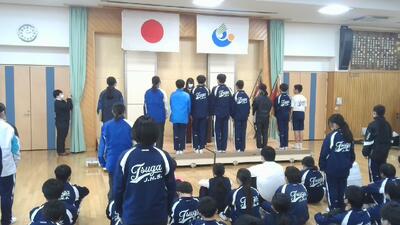 サッカー部の新人地区大会の優勝をはじめ、体力テストS認定、吹奏楽部の地区音楽祭優秀賞などたくさんの表彰がありました。