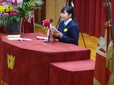 校長式辞、来賓祝辞の後には、在校生を代表して現生徒会長が送辞を述べ、卒業生を代表して前生徒会長が答辞を述べました。これまでの学校生活への感謝や仲間との思い出、未来への決意が語られ、会場は感動に包まれました。