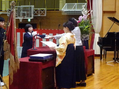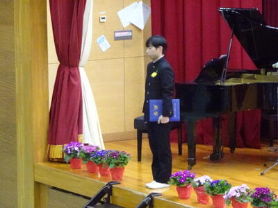 堂々とした入場で式が始まり、国歌斉唱の後、卒業証書授与が行われました。担任の先生の呼名に対し、卒業生一人一人が気持ちのこもった返事をし、校長先生から卒業証書を受け取りました。