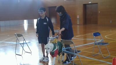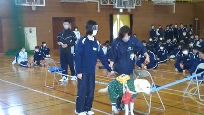 人権擁護委員、盲導犬協会の職員の方が来校し、視覚障がい者の方への適切な対応のしかたを教えていただき、盲導犬への正しい理解へ導いてくださいました。